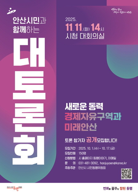 토론회는 안산시민 누구나 참여할 수 있으며, 선착순으로 150명을 모집한다. 참가를 원하는 시민은 오는 17일까지 홍보자료의 QR코드·안산시청 누리집 ‘동행 이야기’·안산시청 ‘새소식’란을 통해 신청서를 내려받아 작성 후 이메일로 제출하면 된다.