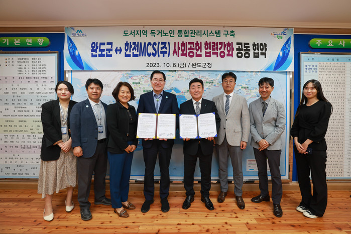 [전남=프레스뉴스] 박정호 기자= 전남 완도군은 지난 6일 한전MCS(주)와 도서지역 독거노인 통합 관리시스템 구축을 기반으로 하는 ‘사회공헌 협력 강화’에 관한 업무 협약을 체결했다.