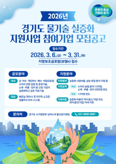 [프레스뉴스] 강보선 기자= 경기도가 ‘2026년 경기도 물기술 실증화 지원사업’ 참여 기업을 공개 모집한다.