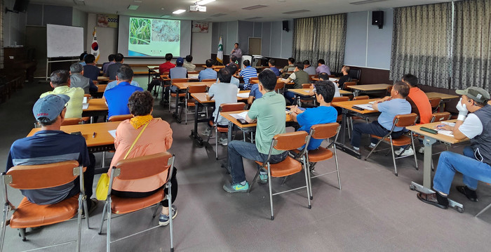 | ▲농업기술센터 교육관에서 실시된 공중육모 재배기술 교육 모습(사진제공=함평군) |