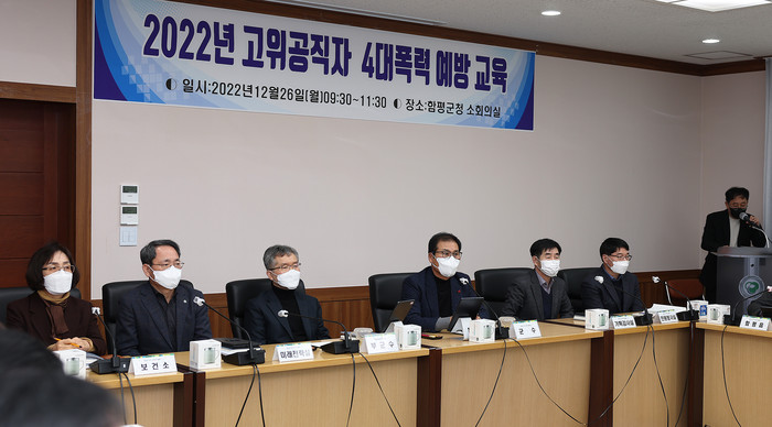 함평군은 “‘2022년 직장내 4대폭력 예방교육’이 지난 26일 엑스포공원과 군청 소회의실에서 고위공직자 및 6급이하 전 직원을 대상으로 추진됐다”고 27일 밝혔다.