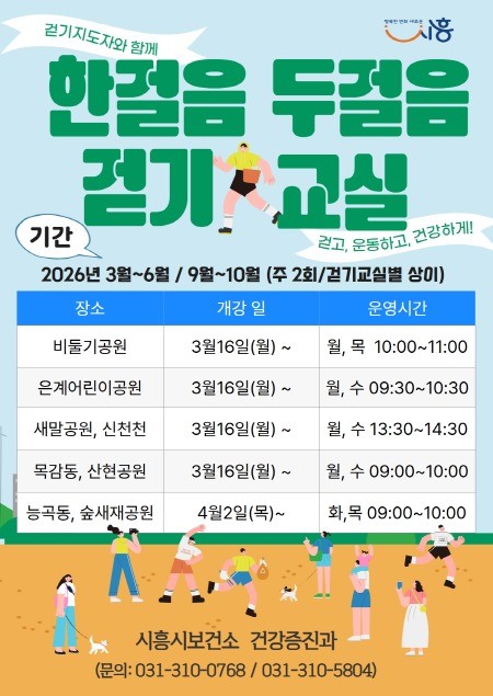 걷기교실은 3월부터 6월, 9월부터 10월까지 주 2회(권역별 상이) 운영된다. 상반기 프로그램은 ▲비둘기공원(월·목 10:00~11:00) ▲은계어린이공원(월·수 09:30~10:30) ▲새말공원·신천천(월·수 13:30~14:30) ▲목감동 산현공원(월·수 09:00~10:00)에서 3월 16일부터 운영된다. ▲능곡동 숲새재공원은 4월 2일부터 화·목 09:00~10:00에 진행된다. 하반기 일정은 9월부터 10월까지 권역별 여건에 맞춰 동일하게 운영될 예정이다.