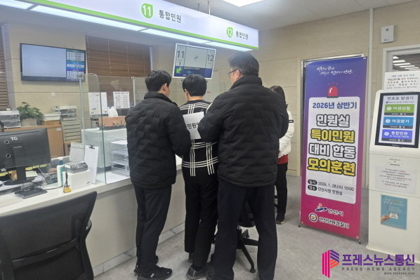 [프레스뉴스] 장현준 기자= 안산시(시장 이민근)는 지난 28일 오전 시청 민원실에서 특이 민원 발생 상황에 대비한 비상 대응 모의훈련 및 출입제한·퇴거 조치 교육을 실시했다고 29일 밝혔다.