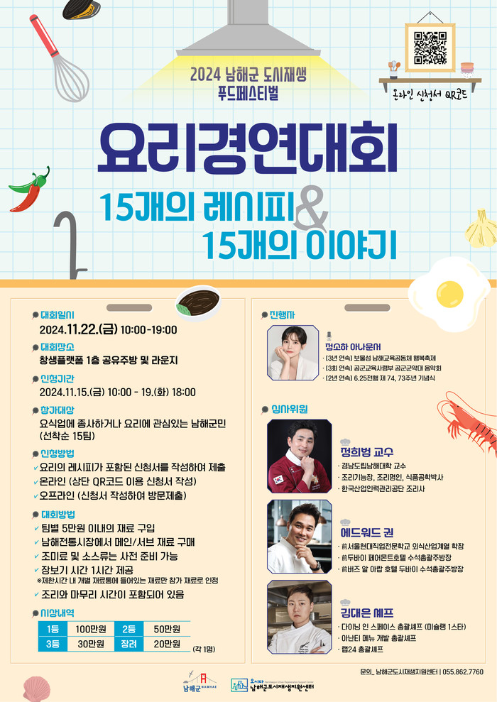 요리경연대회는 ‘15개의 레시피, 15개의 이야기’라는 주제로 열리며, 남해의 잊힌 맛과 남해의 새로운 맛을 동시에 찾아 나서는 시간이 될 것으로 기대된다.