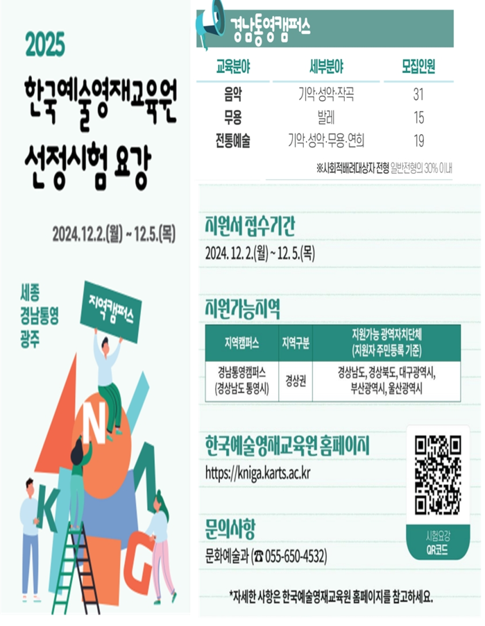| ▲한국예술종합학교 한국예술영재교육원에서는 경남통영캠퍼스의 2025년도 교육생을 오는 12월 2일(월)~ 5일(목)까지 모집한다고 12일 밝혔다. (사진=한국예술영재교육원) |