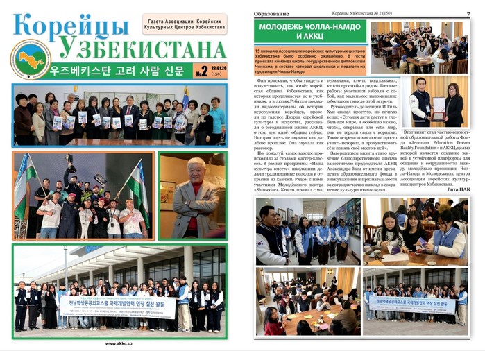 | ▲‘우즈베키스탄 고려 사람 신문’에 게재된 전남학생공공외교스쿨 활동 모습./전라남도교육청 제공 |
