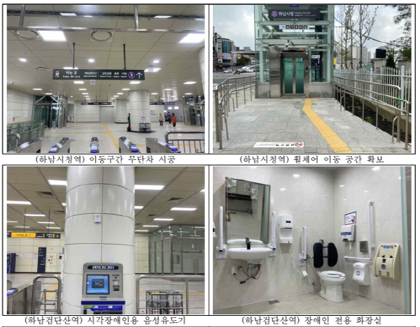 하남시청역과 하남검단산역은 설계 당시부터 장애물 없는 생활환경 디자인 개념을 도입한 철도시설로 ▲이동구간 무단차 시공 ▲계단 미끄럼 방지 시설 ▲장애인 전용 화장실 ▲휠체어 이동 공간 확보 ▲촉지도식 안내판 설치 등을 반영했다.