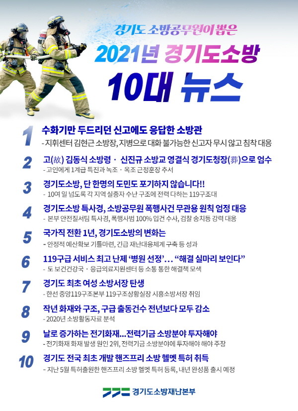 한편, 이번에 선정된 2021 경기도소방 10대 뉴스는 오는 31일 경기도 소방재난본부 홈페이지를 통해 동영상으로 만나볼 수 있다.