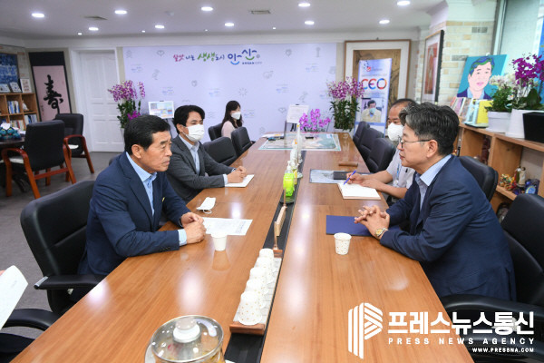 ▲ 윤화섭 안산시장이 2021년 7월 30일 시청에서 현대건설 컨소시엄 관계자와 GTX-C노선 안산 연장을 위한 협의를 진행하고 있다.(사진=경기도) |