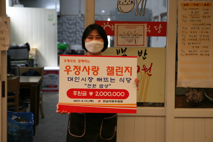 [전남=프레스뉴스] 강래성 기자=전남지방우정청(청장 정창림)은 지난 15일 코로나19로 어려움을 겪고 있는 지역사회 소외계층을 위하여‘우정사랑 릴레이 챌린지’를 시작했다.