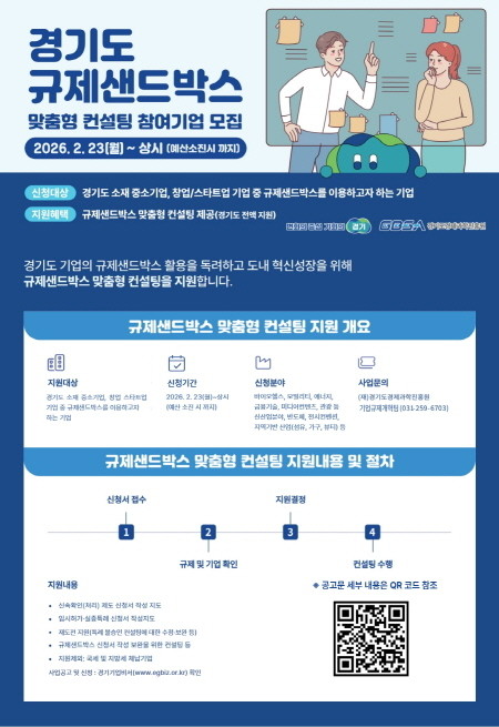| ▲2026년 경기도 규제샌드박스 맞춤형 컨설팅 참여기업 모집 포스터(사진=경기도) |