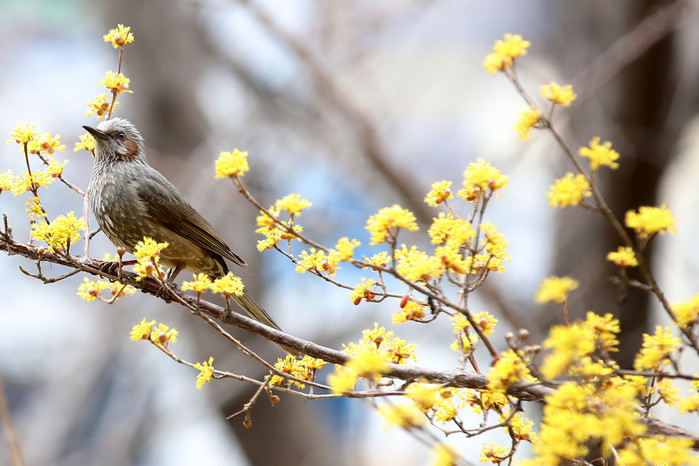 | ▲ 3일 부산 수영구 수영사적공원에서 직박구리가 활짝 핀 산수유 나무에 앉아 있다./사진-뉴스1 |