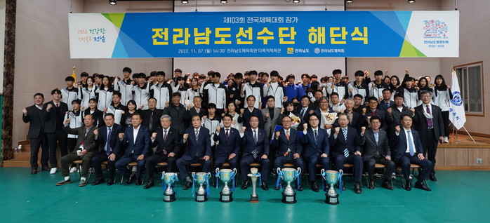 전라남도체육회(회장직무대행 최기동)는 7일 전남체육회관 다목적체육관에서 최기동 전남체육회장직무대행과 문금주 전남도행정부지사, 김태균 전남도의회 부의장, 황성환 전남도교육청 부교육감을 비롯해 전남체육회 임원, 시군체육회 임원, 회원종목단체 및 유관기관단체 임원을 비롯해 입상학교장, 입상선수단 총 150여명이 참석한 가운데 ‘제103회 전국체육대회 전남선수단 해단식’을 가졌다.