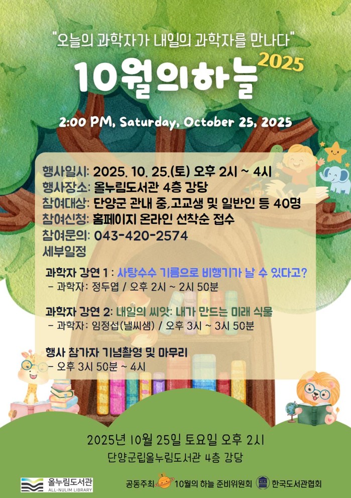 올누림도서관에서는 이날 오후 2시 도서관 4층 강당에서 정두엽 강사의 ‘사탕수수 기름으로 비행기가 날 수 있다고?’와 임정섭 강사의 ‘내일의 씨앗: 내가 만드는 미래 식물’ 두 가지 주제 강연이 진행될 예정이다.