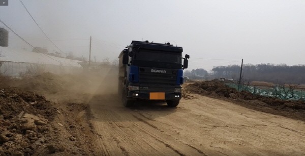 | ▲ 특사경 단속현장(비포장도로 진입로에 살수를 하지 않고 덤프트럭 운행) |