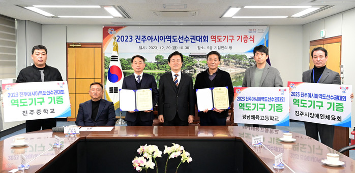 이번 기증식은 진주시 최초로 개최된 국제체육대회인 2023 진주아시아역도선수권대회의 성공적 개최를 기념하고 역도기구 기증을 통한 학생 선수들의 경기력 향상 및 역도 종목의 활성화를 지원하고자 마련됐다.
