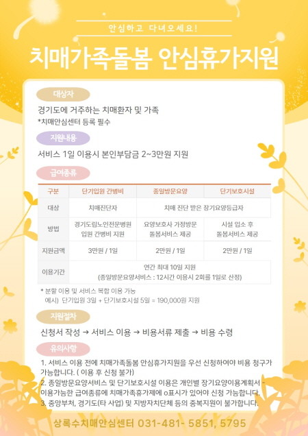 안심휴가지원사업 관련 자세한 사항은 상록수보건소 치매안심센터팀으로 문의하면 안내받을 수 있다.