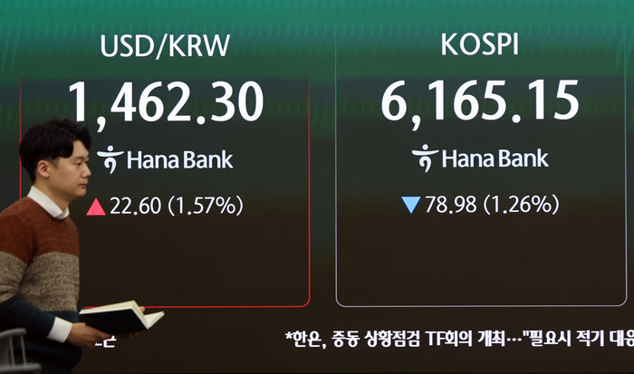 | ▲미국이 이란 공습 후 처음으로 장이 열린 3일 오전 서울 중구 하나은행 본점 딜링룸 전광판에 코스피 지수가 나오고 있다./사진-뉴스1 |
