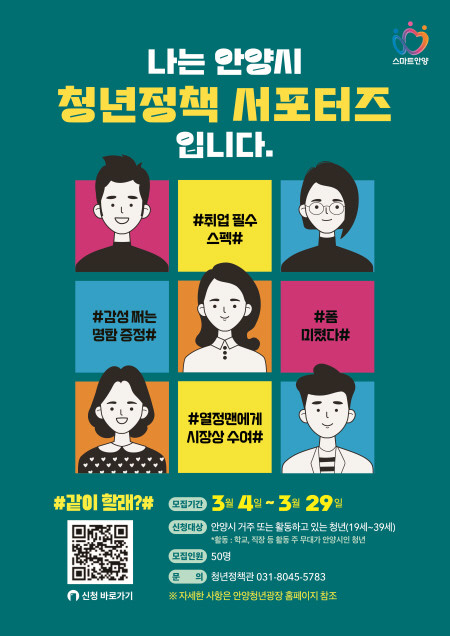 최대호 시장은 “청년특별도시 안양에서 청년들이 꿈을 향해 끊임없이 도전할 수 있도록 적극 지원하겠다”며 “올해 활약할 서포터즈 공모에 많은 관심과 응모를 기대한다”고 전했다.