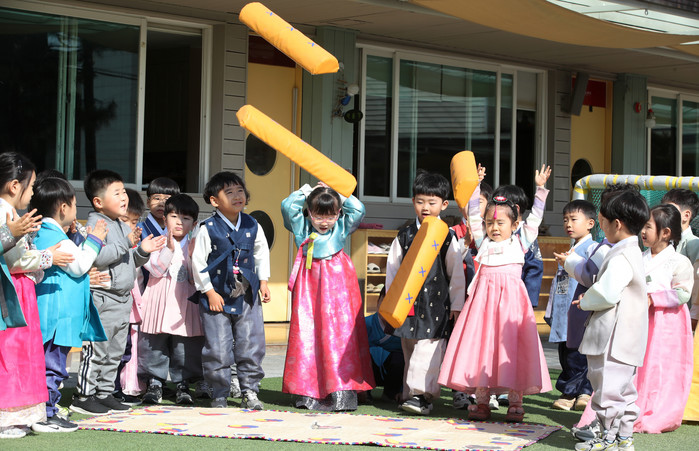 | ▲설 연휴를 앞두고 12일 오전 대구 북구 대원유치원에서 한복을 곱게 차려입은 어린이들이 윷놀이를 하고 있다./사진=뉴스1 |