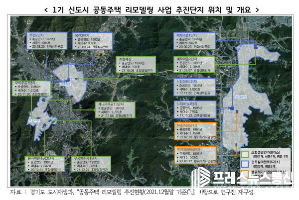 | ▲ 1기 신도시 공동주택 리모델링 사업 추진단지 위치 및 개요(사진=경기연구원) |