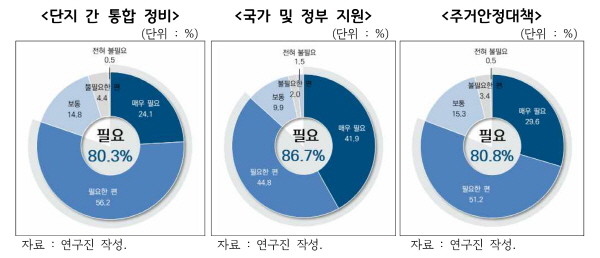 재건축 시 용적률로는 300% 이하가 47.8%, 층수는 21~30층이 56.2%로 가장 많이 나왔다. 단지 간 통합 정비(80.3%), 국가 및 정부의 지원(86.7%), 순환형 개발과 재건축 시기 조정 등 주거안정대책(80.8%)도 상당수 동의하며 정책 수요가 큰 것으로 나타났다.