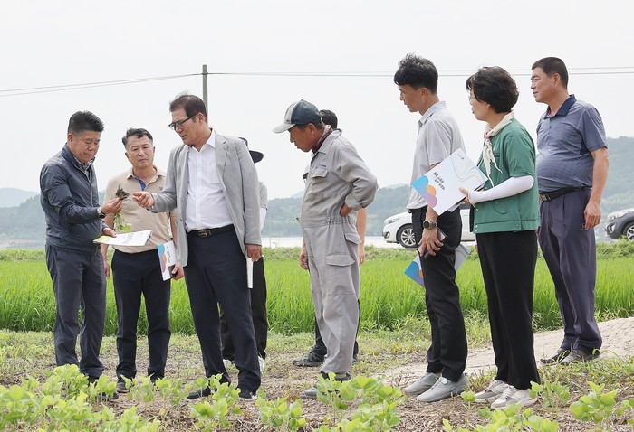 이번 현장 방문은 지속적인 강우로 대부분의 논콩 재배지가 침수되고 습해를 입어 생육이 불량하고 콩 뿌리썩음병 등 병해충이 증가하고 있어 현장을 확인하고 해결책을 모색하고자 추진됐다.