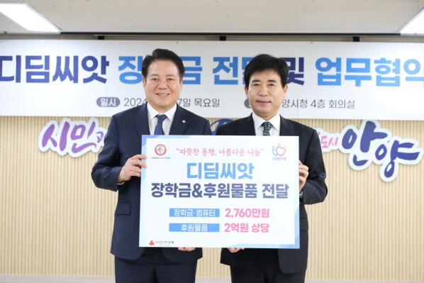[프레스뉴스] 장현준 기자= 안양시(시장 최대호)는 지난 7일 시청 4층 회의실에서 사단법인 희망을나누는사람들(회장 김정안)과 ‘디딤씨앗 장학금 후원사업’ 업무협약을 체결하고 장학증서 전달식을 가졌다고 8일 밝혔다.