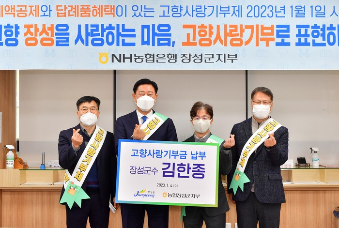 기부를 마친 김한종 장성군수는 “고향사랑기부제는 지방재정 확충뿐만 아니라 지역경제 활성화로 지방소멸을 막는 데에 크게 기여할 것”이라며 “성공적인 제도 안착을 위해 기부문화 확산에 최선을 다하겠다”고 말했다.