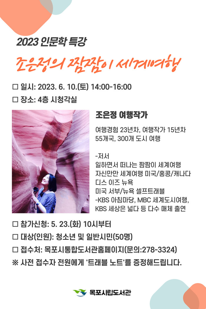 [전남=프레스뉴스] 이광남 기자= 목포시립도서관은 2023 인문학 특강 <조은정의 짬짬이 세계여행>을 오는 6월 10일 운영한다.