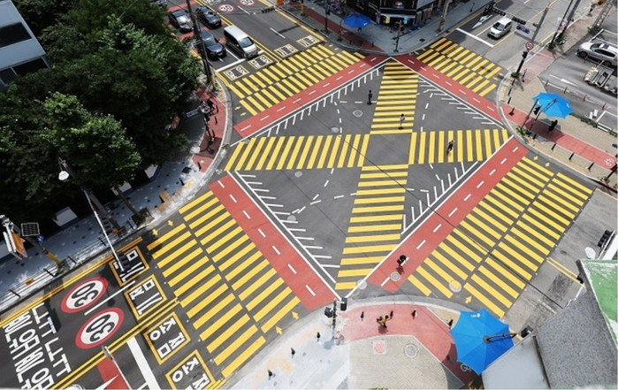 ‘노란색 횡단보도’는 운전자의 시인성을 높여 어린이보호구역 내 교통사고를 예방하기 위해 도입된 것으로, 횡단보도 색깔만으로 자신이 지나는 도로가 어린이보호구역이라는 점을 명확하게 인식하게 해 어린이 교통사고 예방에 효과적이다.