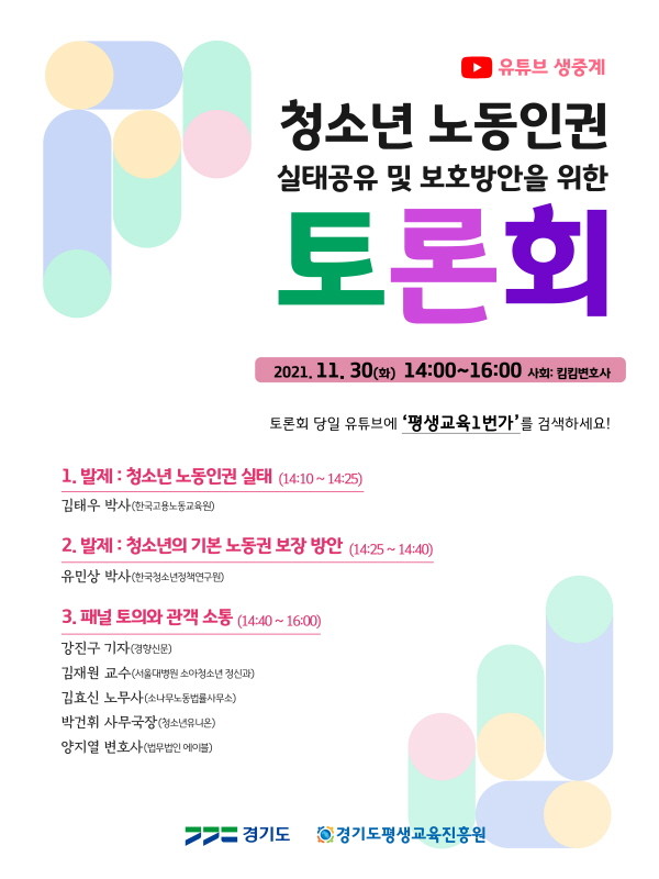 [프레스뉴스] 강보선 기자= 경기도평생교육진흥원이 11월 30일 오후 2시 ‘청소년 노동인권 실태공유 및 보호방안을 위한 토론회’를 온라인 비대면 방식으로 개최한다.