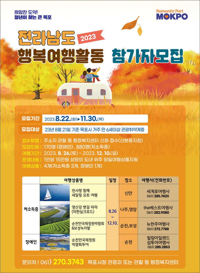 [전남=프레스뉴스] 이광남 기자= 전남 목포시는 여행기회가 적은 장애인 및 저소득층 등 관광 취약계층의 관광기본권을 보장하고 지역 관광 산업 활성화를 위해 ‘2023년 전라남도 행복여행 지원사업’ 참가자를 추가 모집한다.