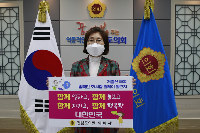 [전남=프레스뉴스] 강래성 기자= 전라남도의회 이혜자 의원(더불어민주당ㆍ무안1)이 12일 ‘저출산 극복 범국민 포(4)함’ 릴레이 챌린지에 참여했다.