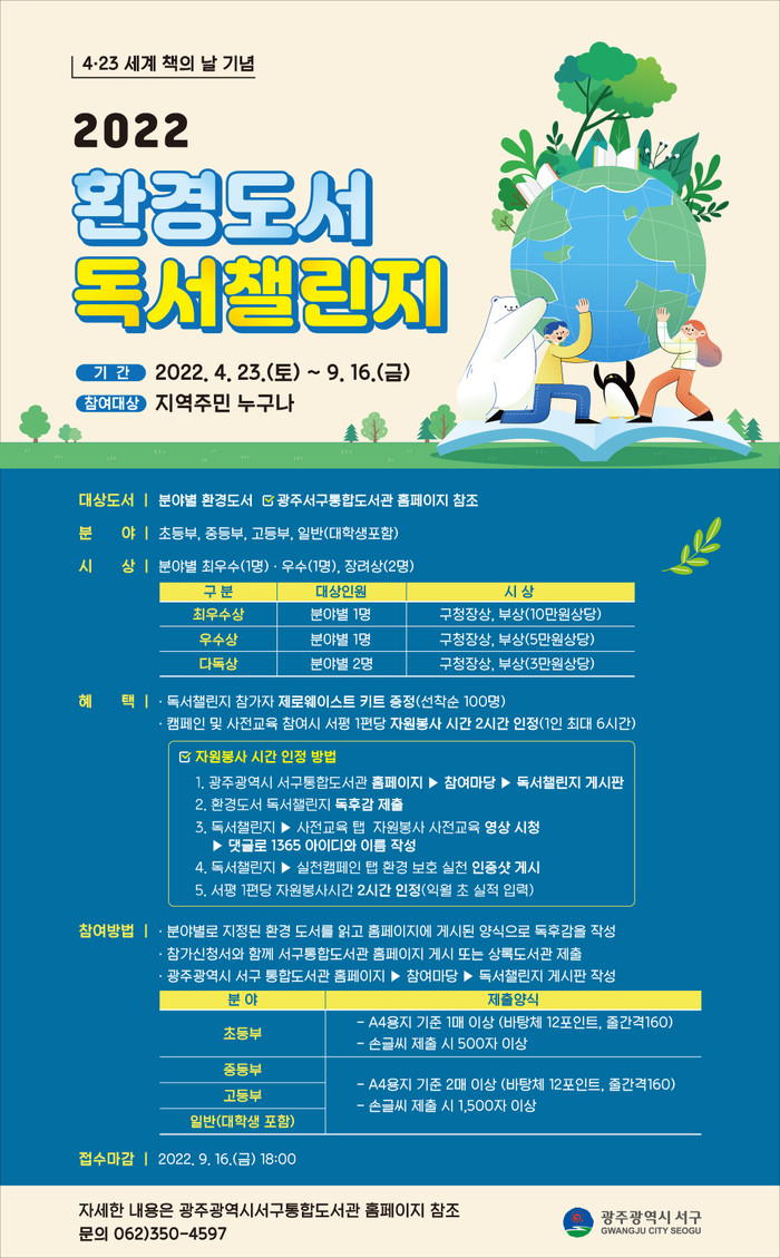 [광주=프레스뉴스] 강래성 기자= 광주 서구(구청장 서대석)가 세계 책의 날(4/23)을 맞이하여 오는 23일부터 9월 16일까지 환경 친화 독서프로그램 ‘환경도서 독서챌린지’를 진행한다.