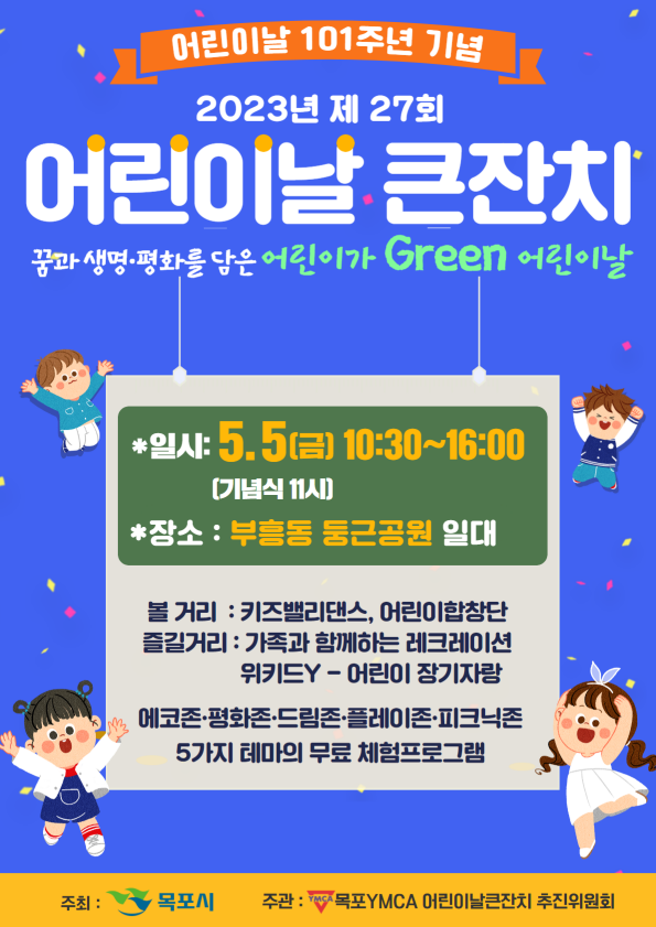 목포시가 주최하고 목포YMCA 주관하는 ‘제27회 어린이날큰잔치’는 「꿈과 생명·평화를 담은 어린이가 Green 어린이날」이라는 주제로 오전 10시 30분부터 오후 4시까지 어린이, 가족 등 1,000여명이 참석한 가운데 진행된다.