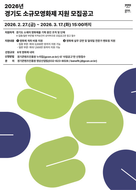[프레스뉴스] 강보선 기자= 경기도와 경기콘텐츠진흥원이 소규모 영화제 활성화를 위해 최대 3천만 원을 지원하는 ‘2026년 경기도 소규모영화제 지원’ 사업 참가자를 3월 17일까지 모집한다.