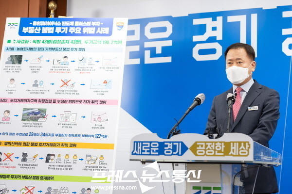 김영수 경기도 공정특별사법경찰단장은 17일 경기도청에서 기자회견을 열고 “지난해 12월부터 용인시 처인구 SK하이닉스 반도체 클러스터 사업 지구 일대를 대상으로 토지거래허가 과정에서 부정허가, 명의신탁, 목적 외 사용 등 위반행위 전반에 대해 기획수사를 실시해 불법행위자 43명을 검거, 전원 검찰에 송치했다”고 밝혔다.