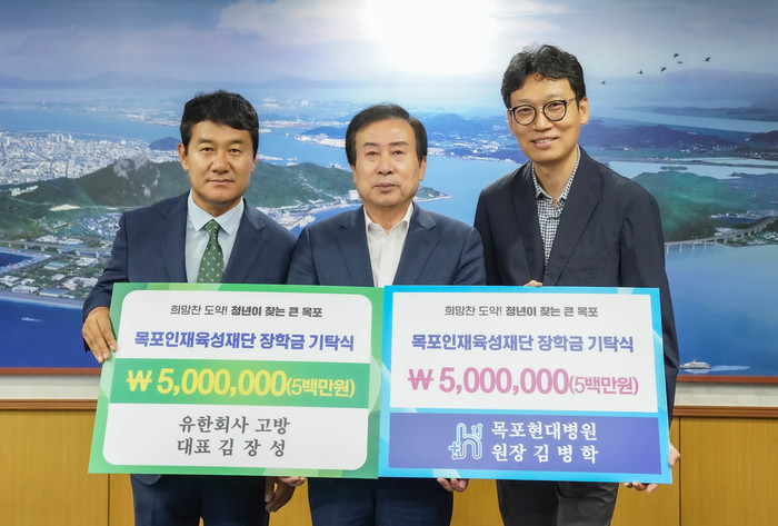 [전남=프레스뉴스] 이광남 기자= 유한회사 고방과 목포현대병원이 지난 11일 목포인재육성재단(이사장 박홍률 목포시장)에 우수인재 양성을 위한 장학기금을 각 500만원씩, 총 1천만원을 기탁했다.
