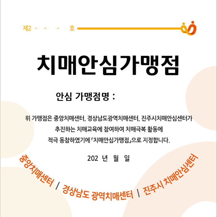 진주시는 2021년부터 현재까지 약국, 식당, 미용실 등 40개소의 치매안심가맹점을 운영 중이며 지속적으로 확대해 나갈 예정이다.