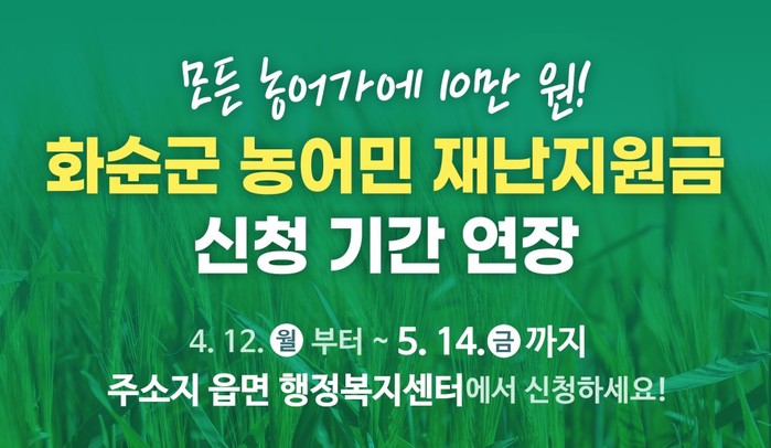 [전남=프레스뉴스] 박정철 기자= 화순군(군수 구충곤)이 전체 농어민에게 지급하는 ‘화순군 농어민 재난지원금’ 신청·접수 기간을 5월 14일까지 연장했다.