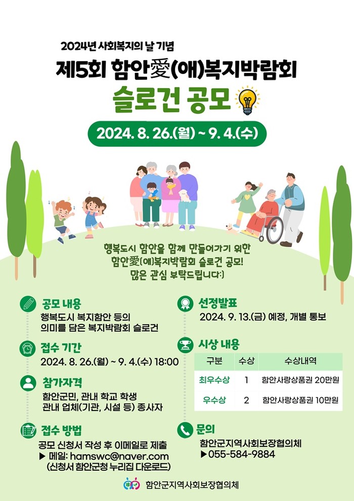 슬로건 공모는 함안군민 누구나 참여 가능하며, 행복도시 복지함안 등 복지박람회 행사 취지와 의미를 담은 내용으로 제안하면 된다. 참여를 희망하는 자는 함안군청 홈페이지에서 공모신청서를 내려받아 작성 후 함안군지역사회보장협의체 메일로 제출하면 된다.