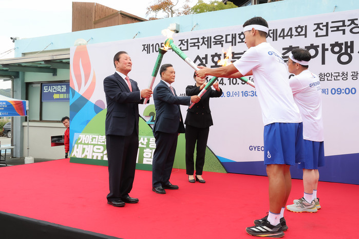 | ▲함안군은 지난 9일과 10일 군청 광장에서 ‘제105회 전국체육대회’ 및 ‘제44회 전국장애인체육대회’의 성공적인 개최를 기원하기 위한 성화봉송 안치식과 출발식을 진행했다 (사진=함안군) |