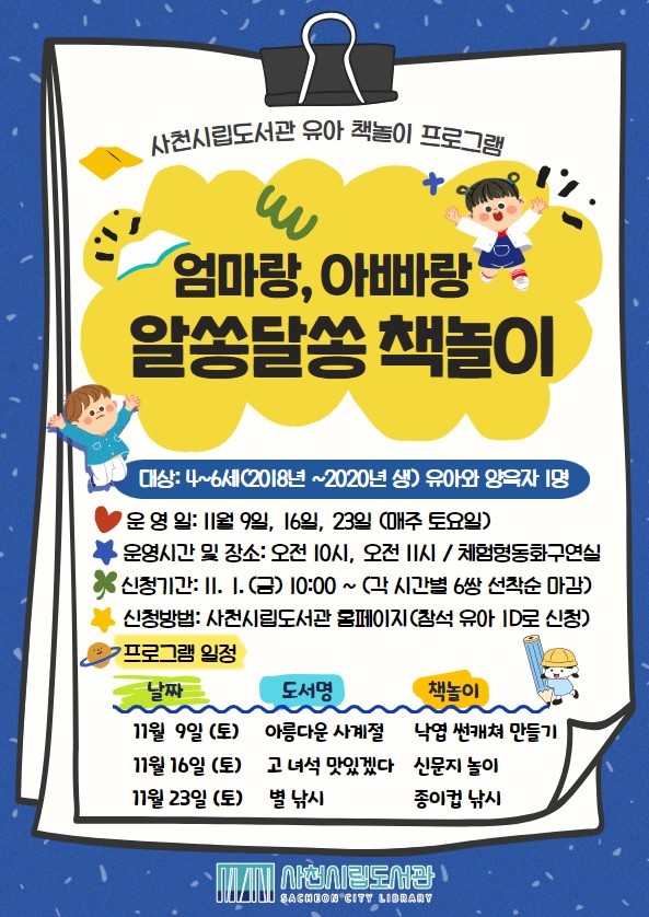 | ▲사천시립도서관은 11월 매주 토요일마다 미취학 아동(4~6세)과 부모가 함께 참여할 수 있는 책놀이 프로그램 ‘엄마랑 아빠랑 알쏭달쏭 책놀이’를 운영한다 (사진=사천시) |