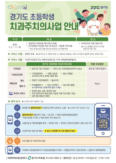 초등학생 치과주치의사업은 영구치아 배열이 완성되고 구강건강 관리 효과가 높은 시기인 초등학교 4학년 아동이 지정 치과 의료기관에서 구강검진, 구강 보건교육, 예방 진료 등을 무료로 받을 수 있는 사업이다. 올해 대상자는 경기도 거주 초등학교 4학년생과 같은 나이의 학교 밖 청소년까지 포함해서 12만 1천592명이다.