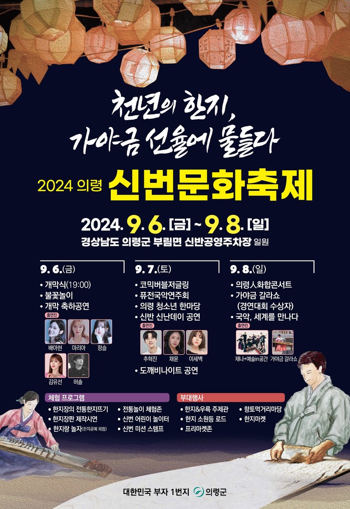 올해로 3회째 개최하는 신번문화축제는 역사와 전통을 이어온 의령의 전통문화 유산인 ‘한지’와 우륵의 탄생지 의령을 널리 알리는 뜻깊은 축제이다.