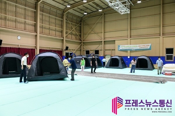 | ▲ 안산시 공무원들이 10일 반월동 창말체육관에서 이재민 임시거주시설을 설치하고 있다.(사진=안산시) |