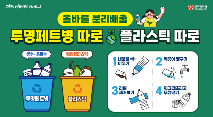 [광주=프레스뉴스] 강래성 기자= 광주광역시는 환경부 지침 개정으로 지난해 12월 ‘투명페트병 분리배출’ 적용대상이 공동주택에서 단독주택, 상가 등 전 지역으로 확대됨에 따라 분리배출 여건이 확보되도록 다양한 지원정책을 시행한다.