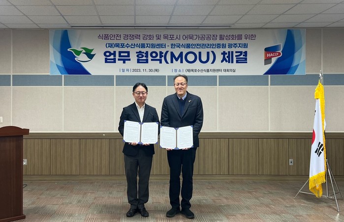 [전남=프레스뉴스] 이광남 기자= (재)목포수산식품지원센터(센터장 이영철)와 한국식품안전관리인증원 광주지원(원장 정보용)이 지난 달 30일 목포어묵 가공공장 건립과 관련해 식품제조분야의 안전관리 수준향상을 위한 업무협약(MOU)을 체결했다.