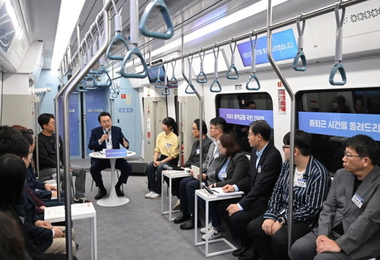| ▲윤 대통령이 6일 오후 경기도 화성 동탄역 GTX-A 열차 내에서 열린 광역교통 국민간담회에서 발언하고 있다. (사진=대통령실) |